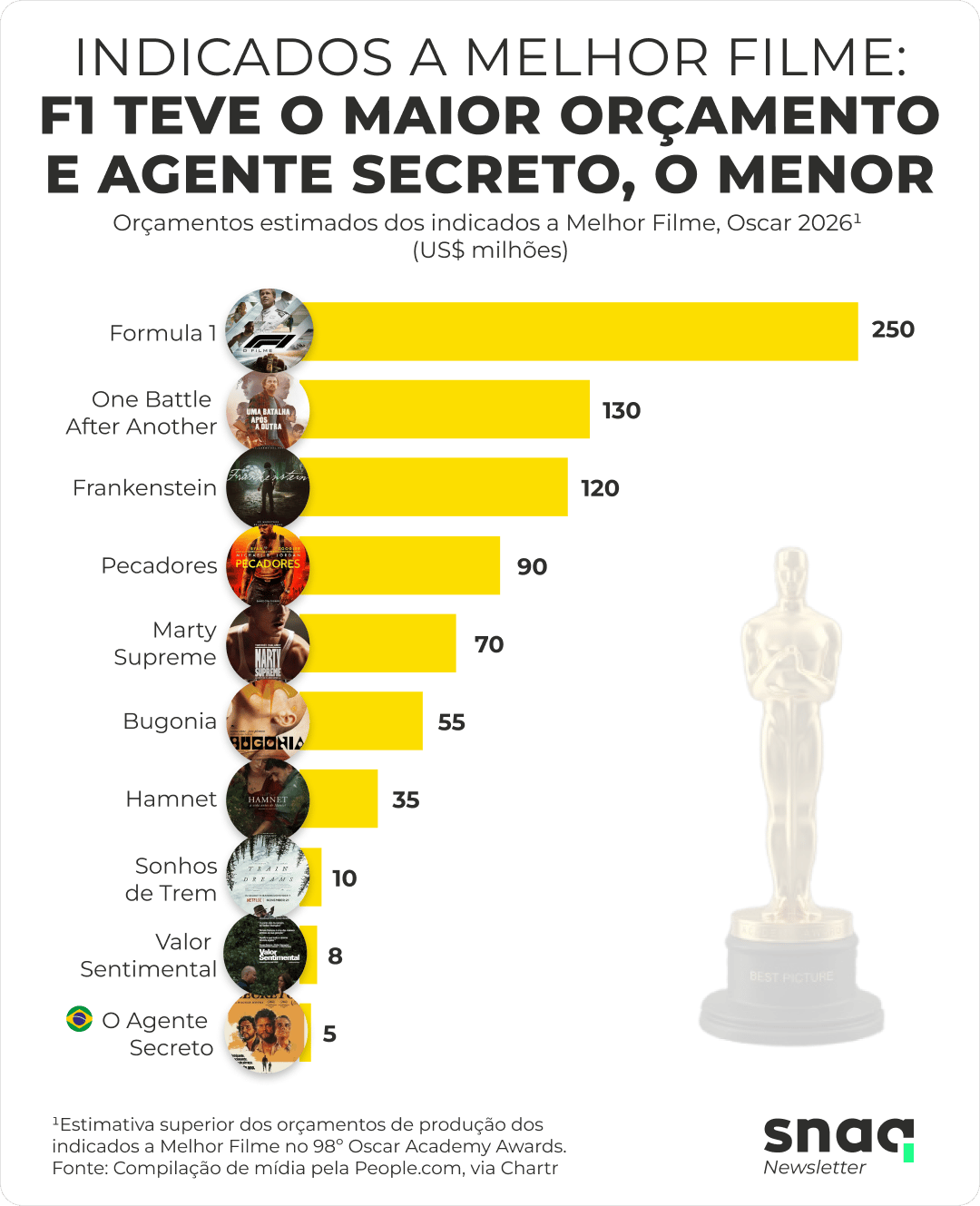 Entre os indicados de 2026, os orçamentos variam drasticamente: Formula 1 lidera com cerca de US$ 250 milhões, enquanto O Agente Secreto foi produzido com cerca de US$ 5 milhões, quase 50 vezes menos.
